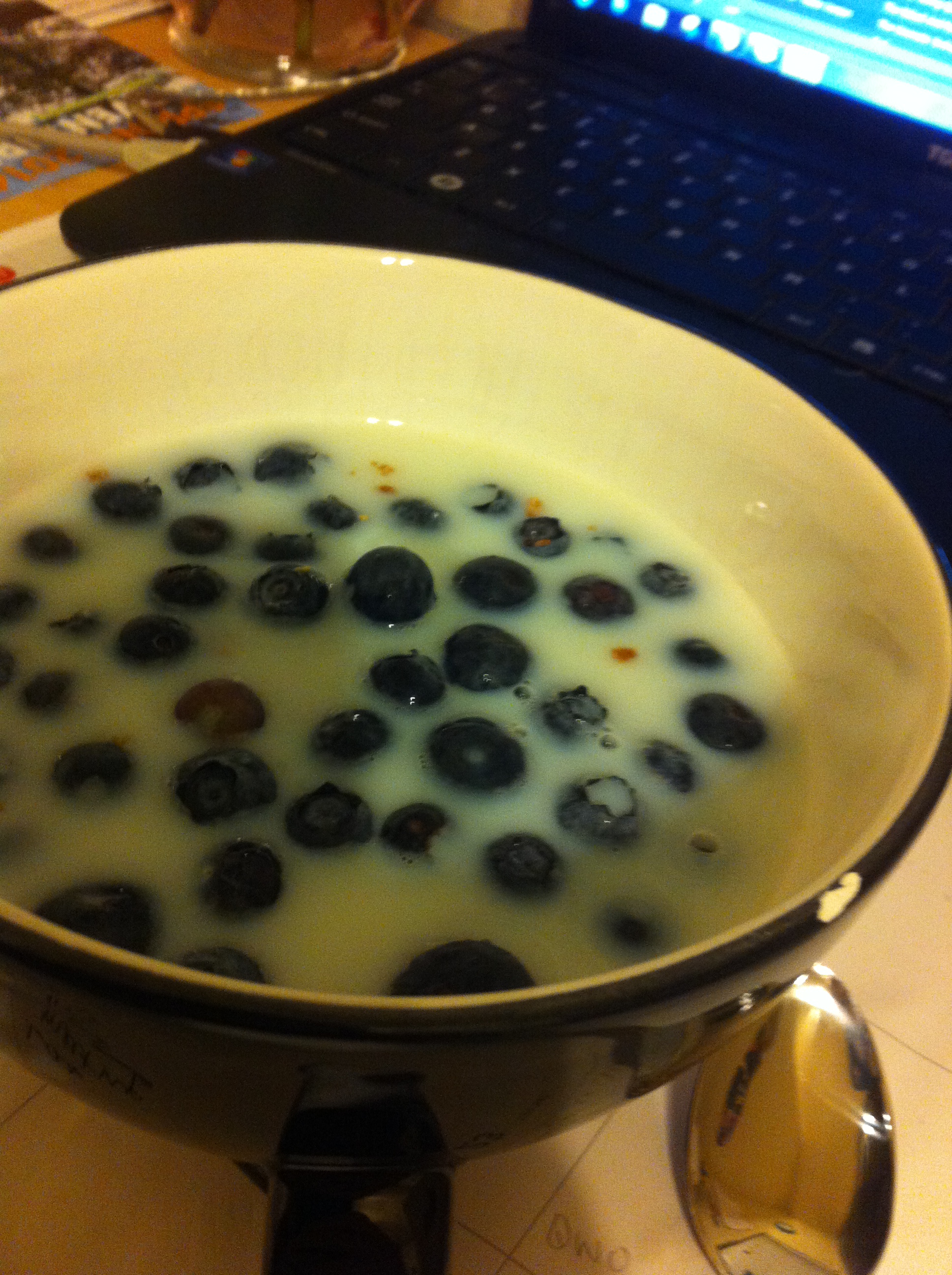 The picture is ugly but it was delicious! GrapeNuts with LOTS of blueberries and honey with fat-free milk!