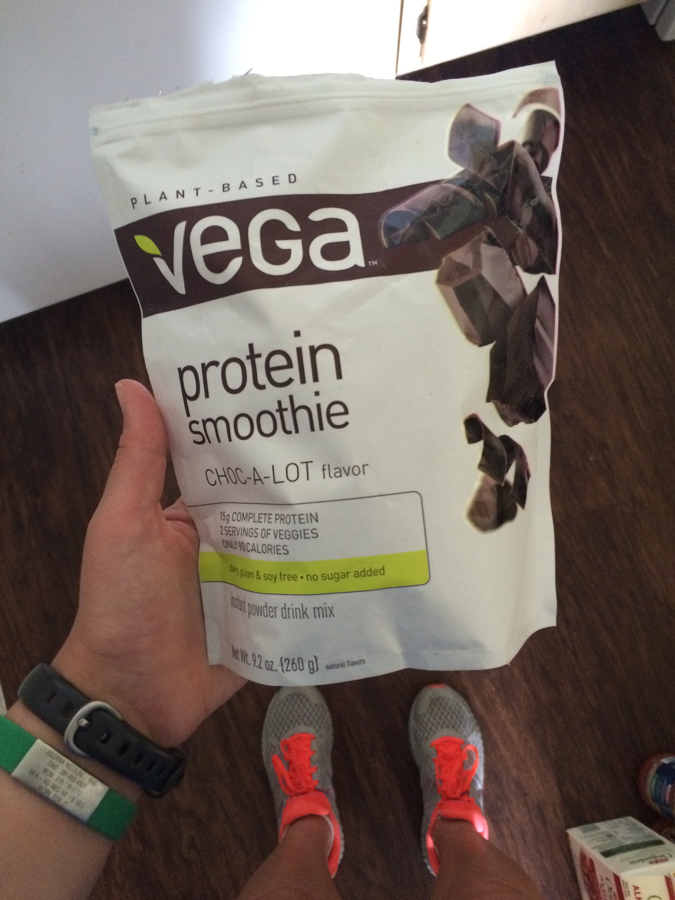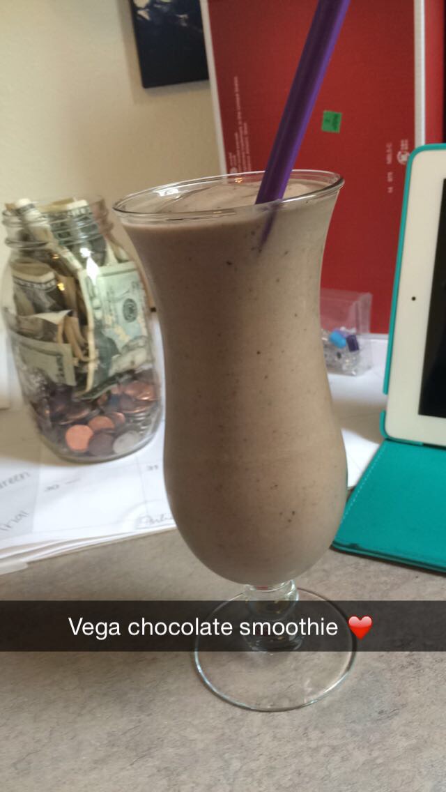 Silk Cashew milk, one scoop of chocolate Vega, two frozen bananas, and a giant spoonful of peanut butter.