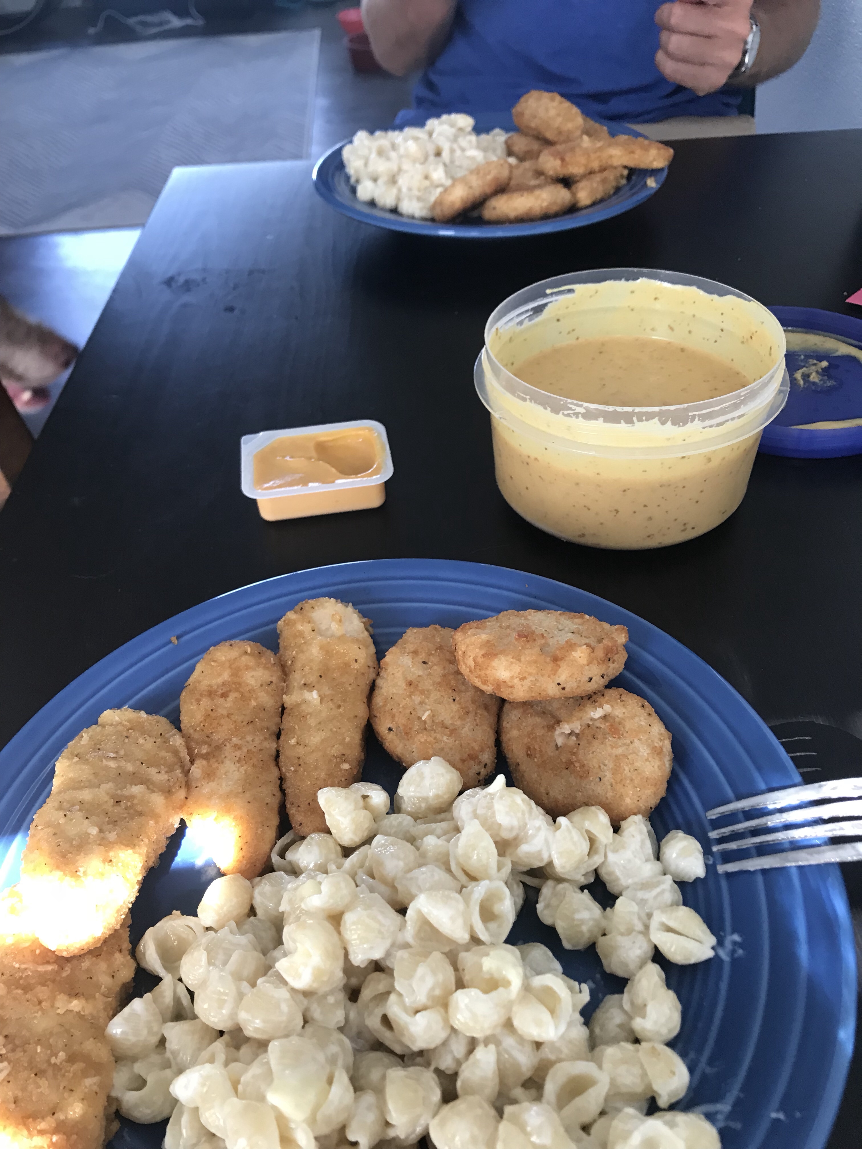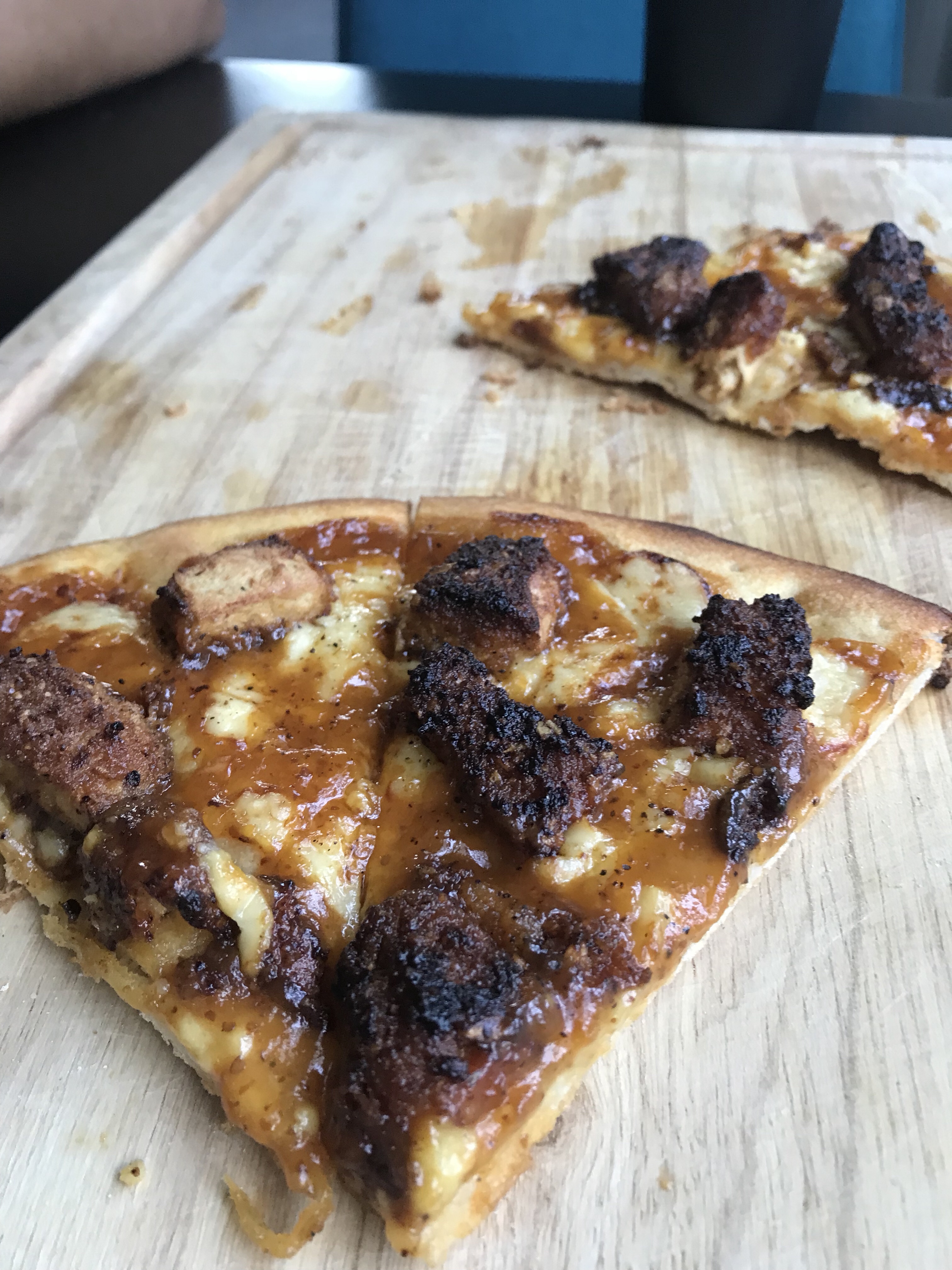 What you’re seeing here is Patrick’s creation. It’s pizza made with that Chick-fil-A sauce, fake chicken, and white cheddar cheese. It was good! Needed waffle fries.