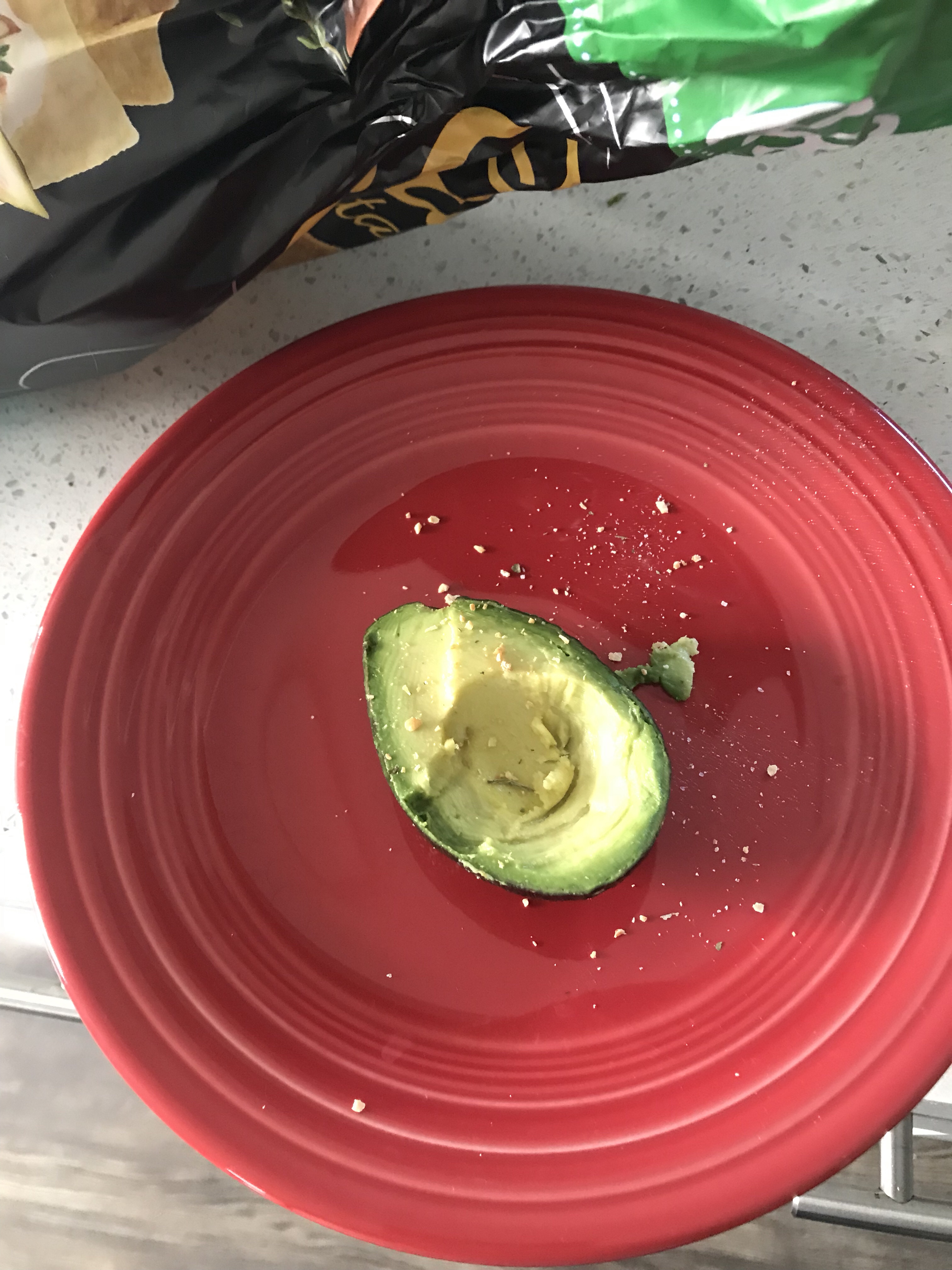 Lastly, but still delicious, avocado that I ate with a fork and pita chips because I saw guacamole on insta and wanted it so badly but was too lazy to make it so I just sprinkled garlic salt on this avocado and called it a day.