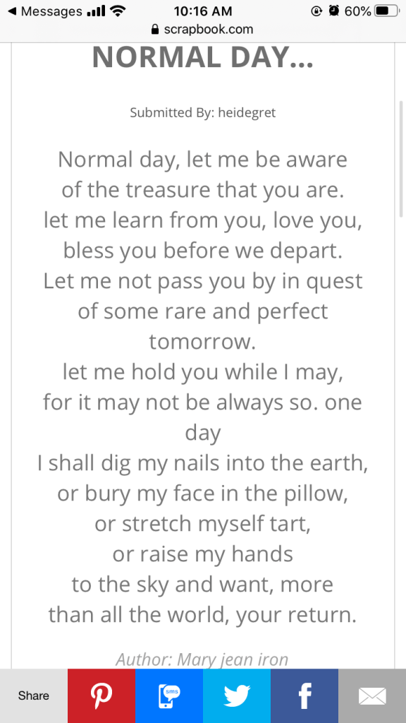 I stumbled across this quote on a blog and loved it. I want to appreciate normal days more, even while they feel so not normal. I’ll try right now: outside the window at this desk I see my tomato plant swaying in the breeze and the dryness of the dirt. I can imagine how it feels to put my hands on the warm soil and can imagine the smell of the rosemary on my fingers when I harvest some to make bread.