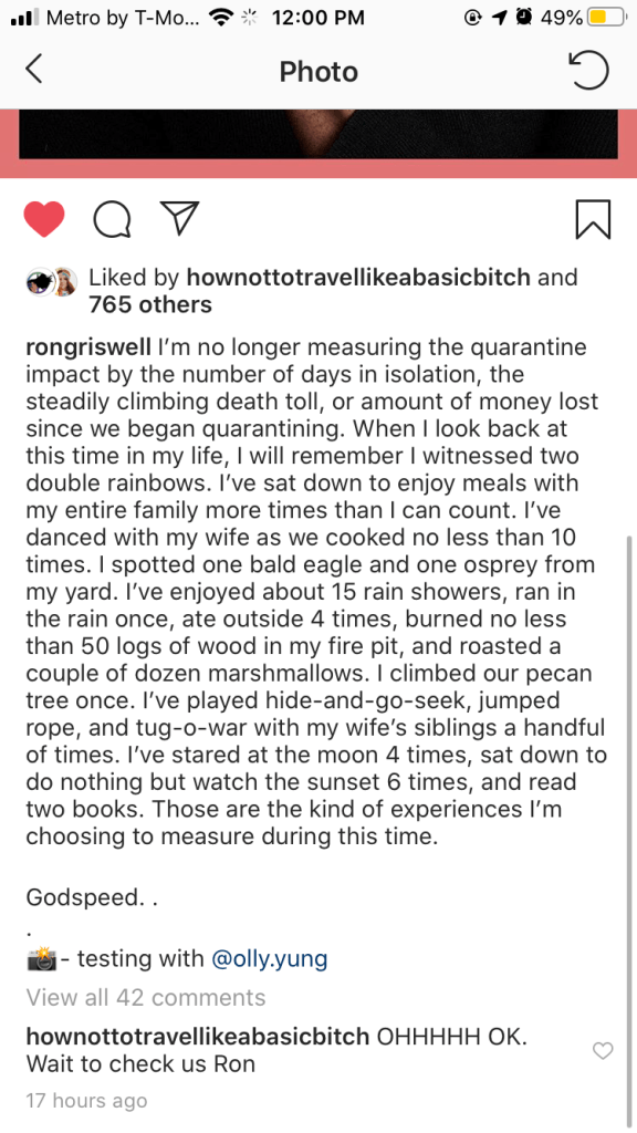 Sitting outside with Patrick in the AM drinking coffee and water and talking about life and politics and whatever comes to mind. He became Dr. Patrick this week, so there were celebrations! Without school to focus on 98% of the time, we’ve been able to hang out and talk more which I love. We also started doing daily PSAs on our Instagrams. We alternate who chooses the topics each day. It’s fun and it gets us outside in the morning and thinking about something silly or serious.