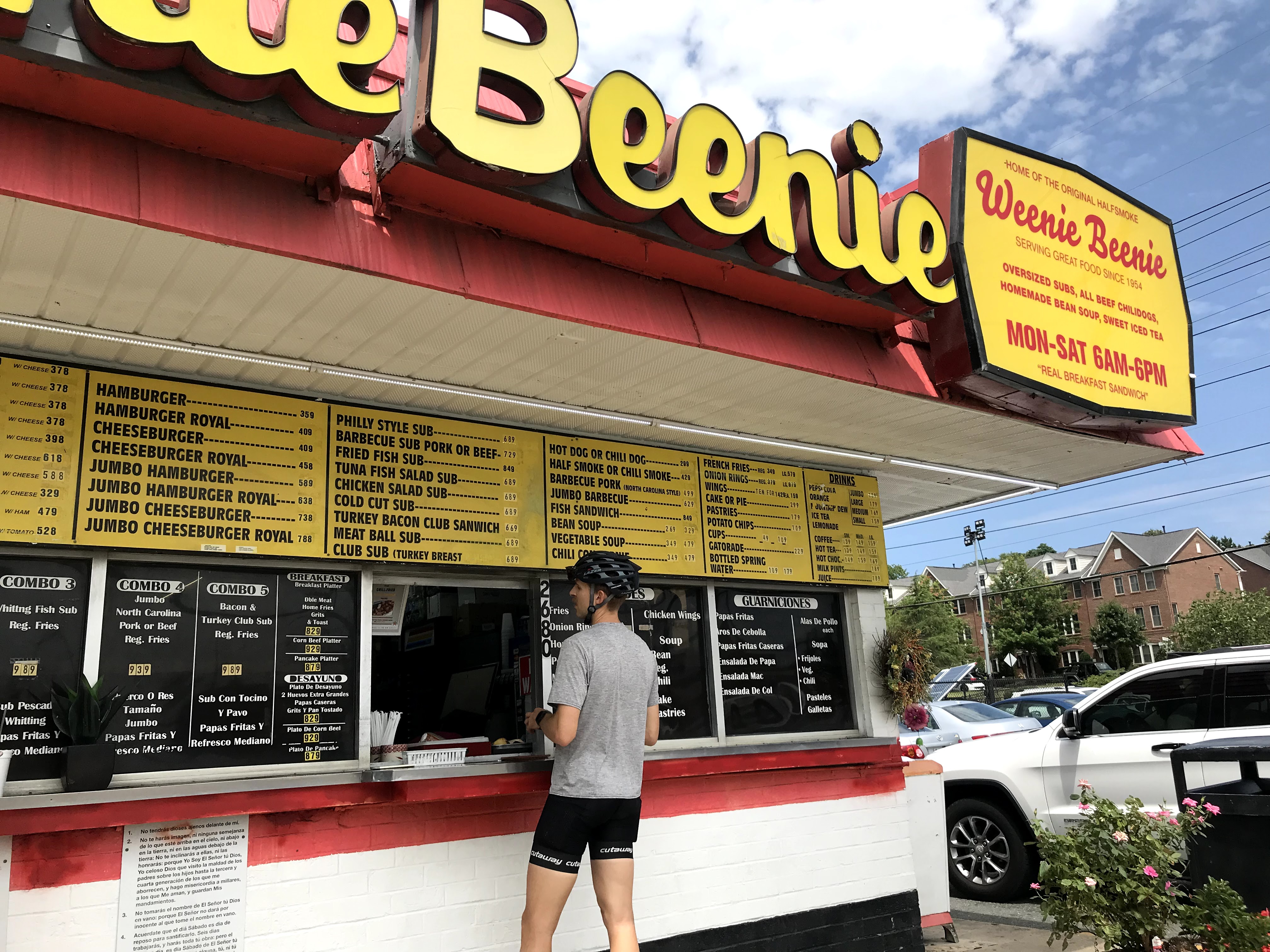 The strength came before the bike ride as a way to active the core and glutes. We had planned to do more riding, but the path we were on got pretty busy which is a little annoying. I was also enjoying the casual riding, so we turned around once we got to Alexandria. We stopped at a hut/shack? called Weenie Beanie that we first passed on a run a few months ago. I got a cheesesteak and Patrick got a hamburger. This place is “known” for its hot dogs, so we both pondered why neither of us chose that after the fact.
