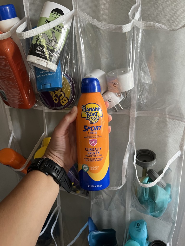 Banana Boat Sport: The go to sunscreen in this household! Spray this bish on before runs, bike rides, going to the pool, going on a hike, generally doing anything outside for a long period of time – you name it! We buy a pack of these cans from CostCo and so they’re scattered around the house and in the car (or the lotion variety is, at least). This shoe hanger in the background holds a ton of our outdoor accessories and is in the front hall closet.