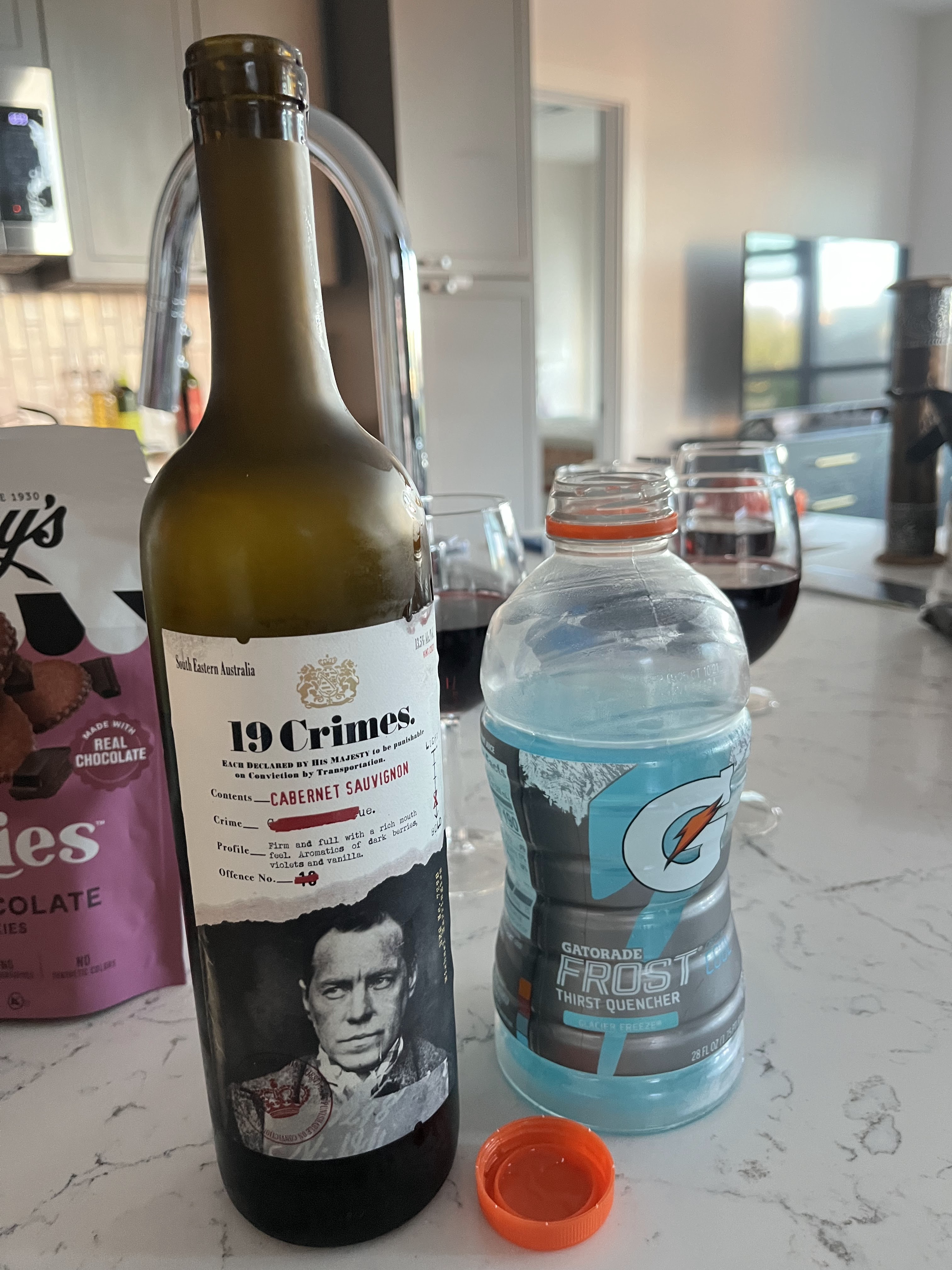 BONUS: Gatorwine – LOLOL. Equal parts blue Gatorade and cheap red wine. Patrick and I saw this in a YouTube video and brought it to Adina and Evan’s house for dinner last night. It is as odd as it sounds. Almost sangria-like? But not quite. I said that if you handed it to me and didn’t tell me what it was then I’d just say it was strange (but not terrible).