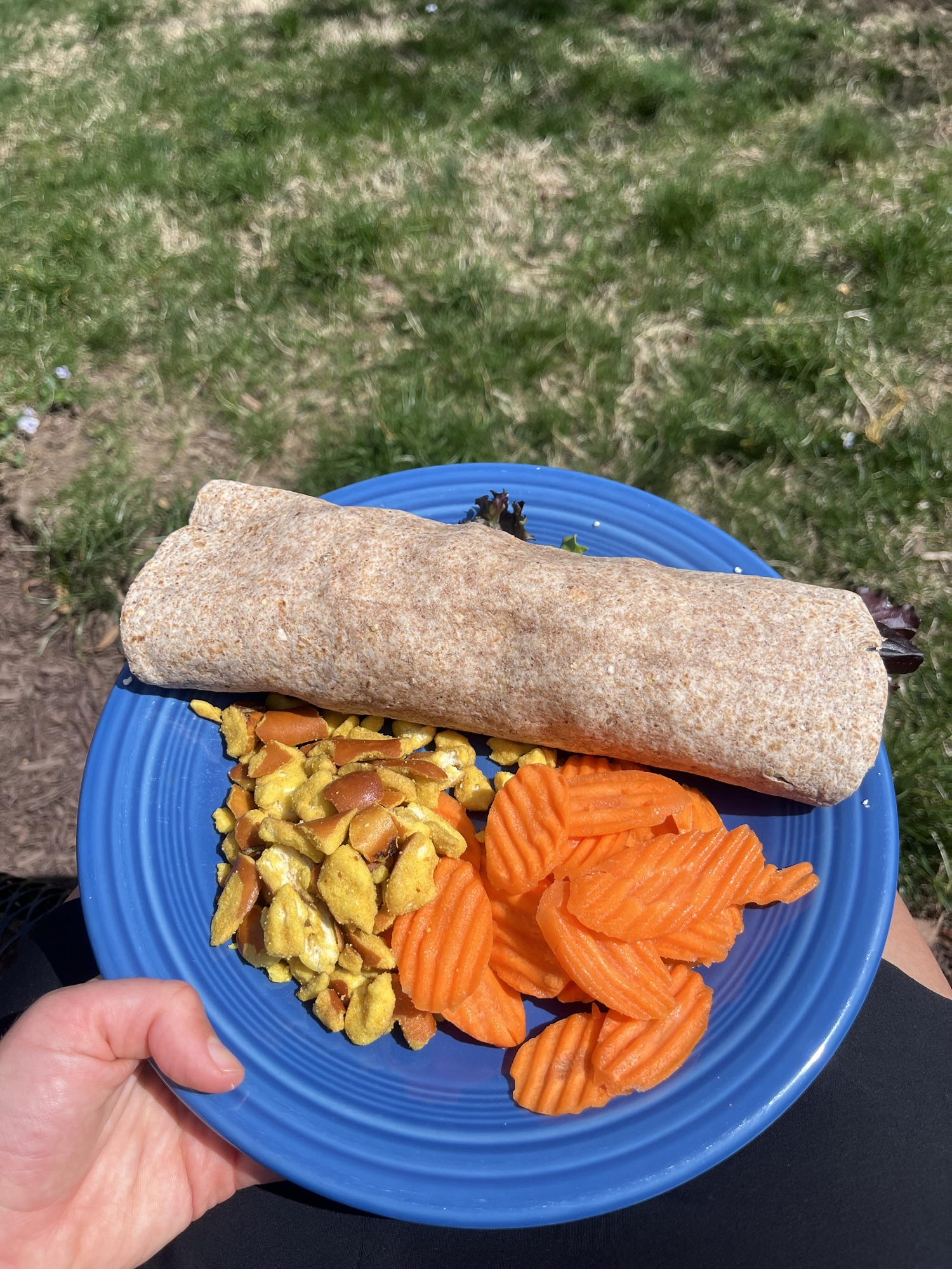 …Eating: Al fresco! With the weather so nice, I simply must eat outside as much as possible. I don’t make the rules. My office building hasn’t put the patio furniture back out yet, unfortunately, but I am eating outside when I WFH! Here’s Monday’s lunch: veggie wrap with honey mustard pretzels and carrot chips. Enjoyed with sparkling water and LMNT on the side.