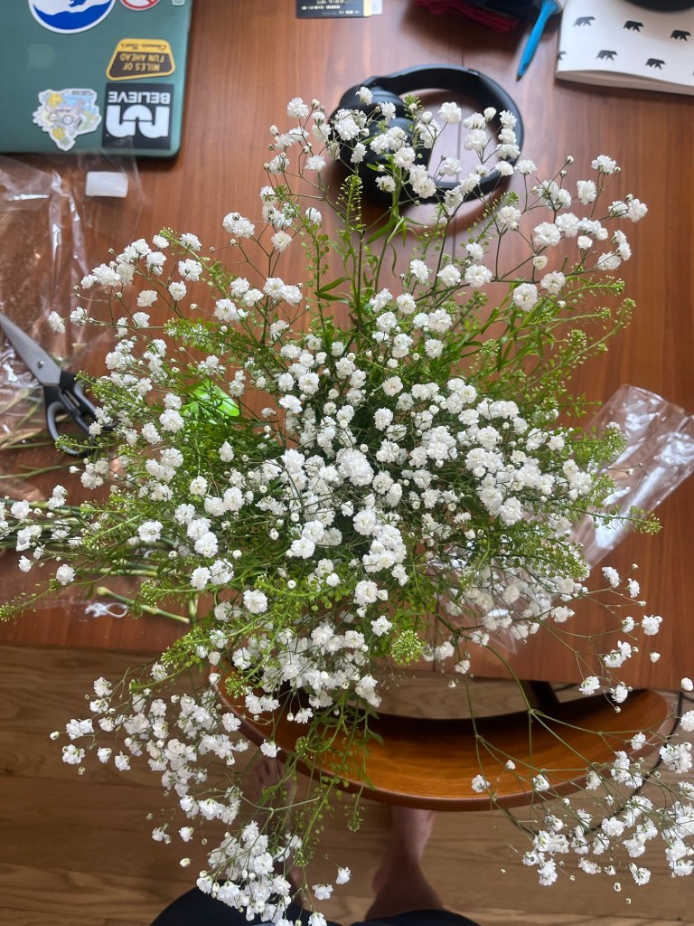 I finally tried my hand at arranging a bouquet of flowers! I bought carnations, baby’s breath, and some random greenery from Trader Joe’s, roughly (emphasis here) cut them to the same length, and then tried to arrange them! I started with the greenery, then added in the baby’s breath, and finished up by trying to evenly place the flowers.