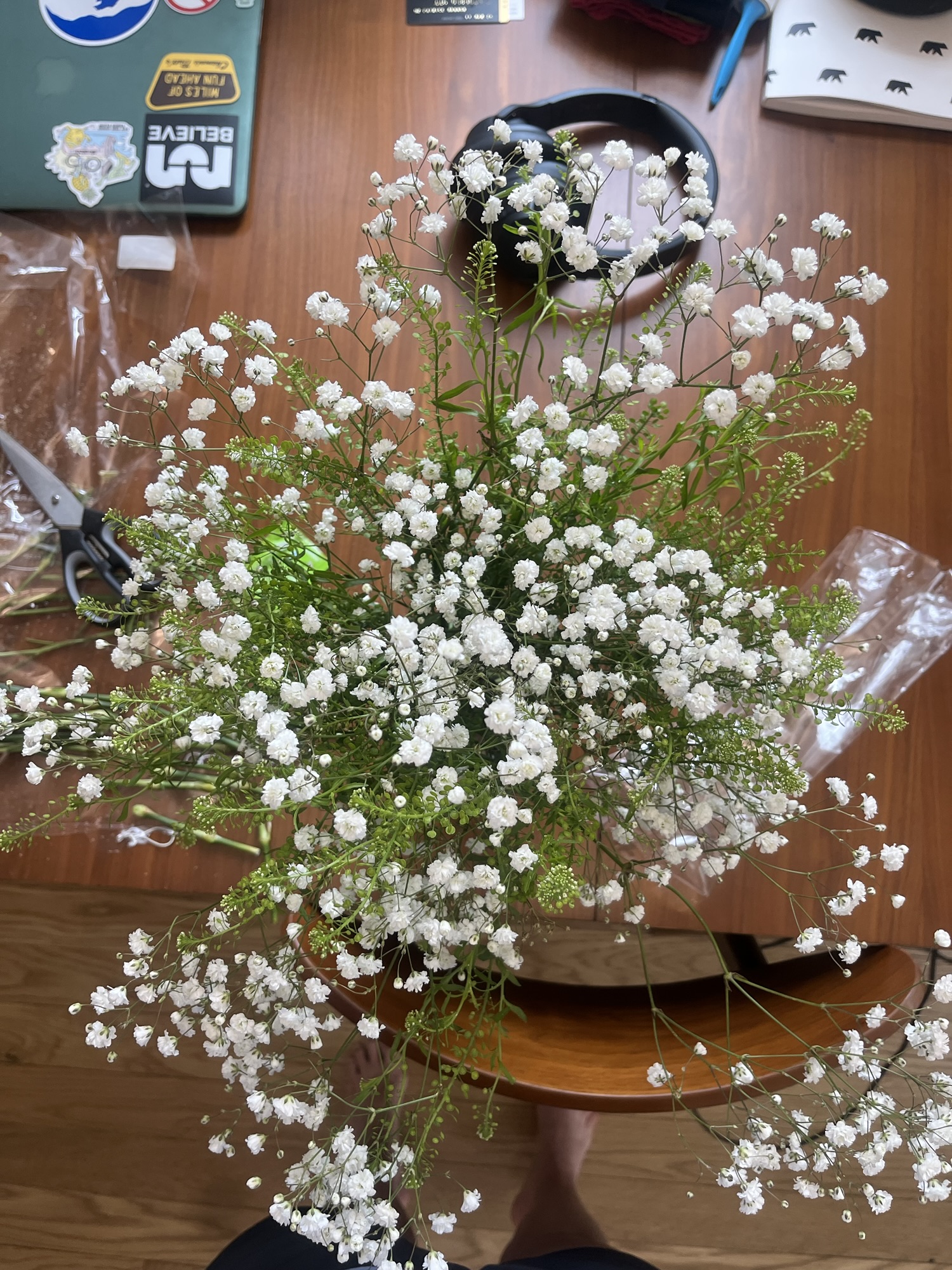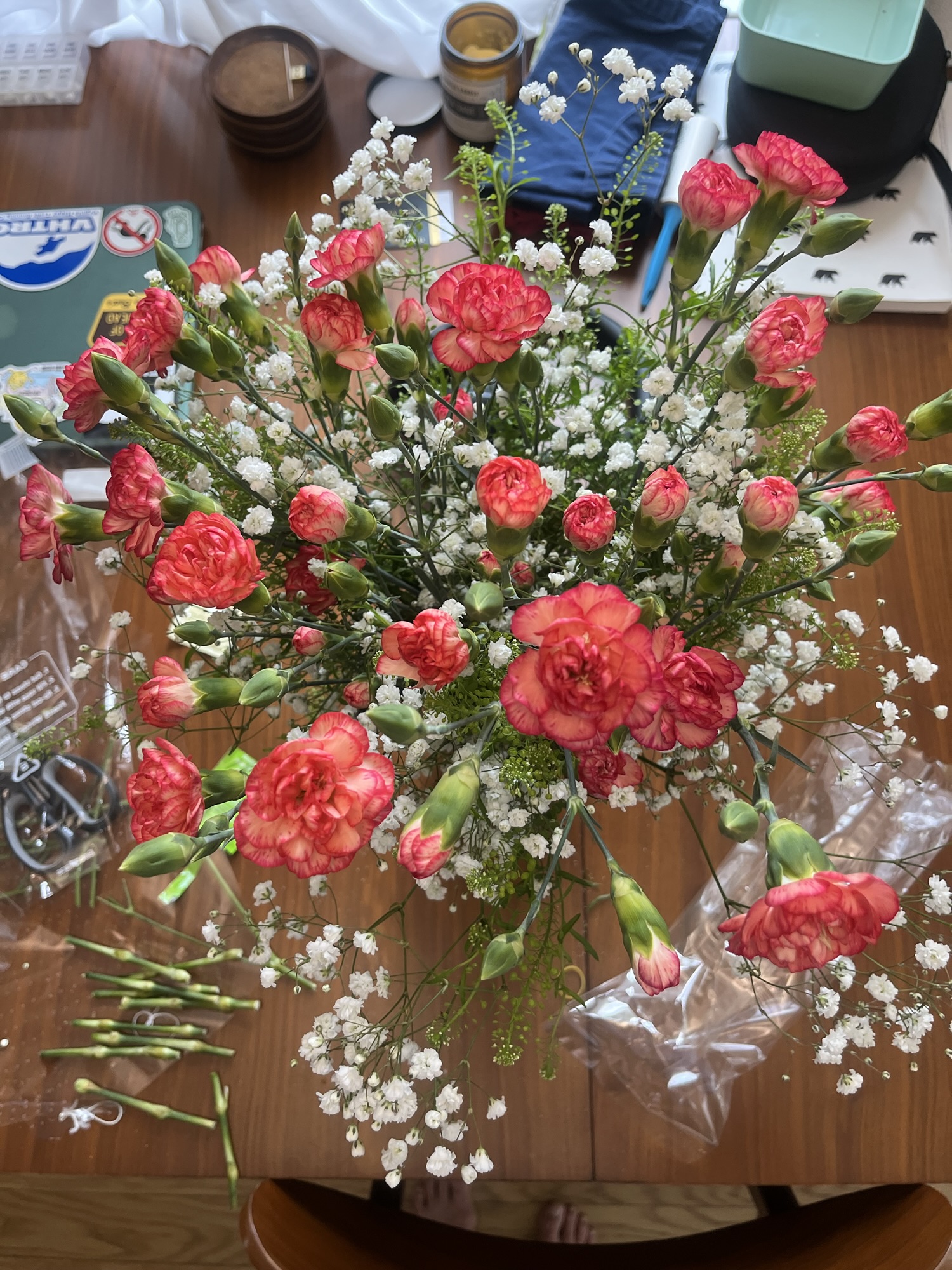 I finally tried my hand at arranging a bouquet of flowers! I bought carnations, baby’s breath, and some random greenery from Trader Joe’s, roughly (emphasis here) cut them to the same length, and then tried to arrange them! I started with the greenery, then added in the baby’s breath, and finished up by trying to evenly place the flowers.