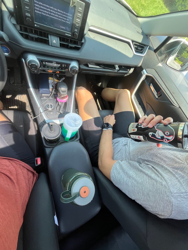 - Gather as much hydration as you can possibly fit into the front seats of your car. This may include but is not limited to: water, Nuun, LMNT, iced tea, iced coffee, sparkling water… Whatever suits your fancy!