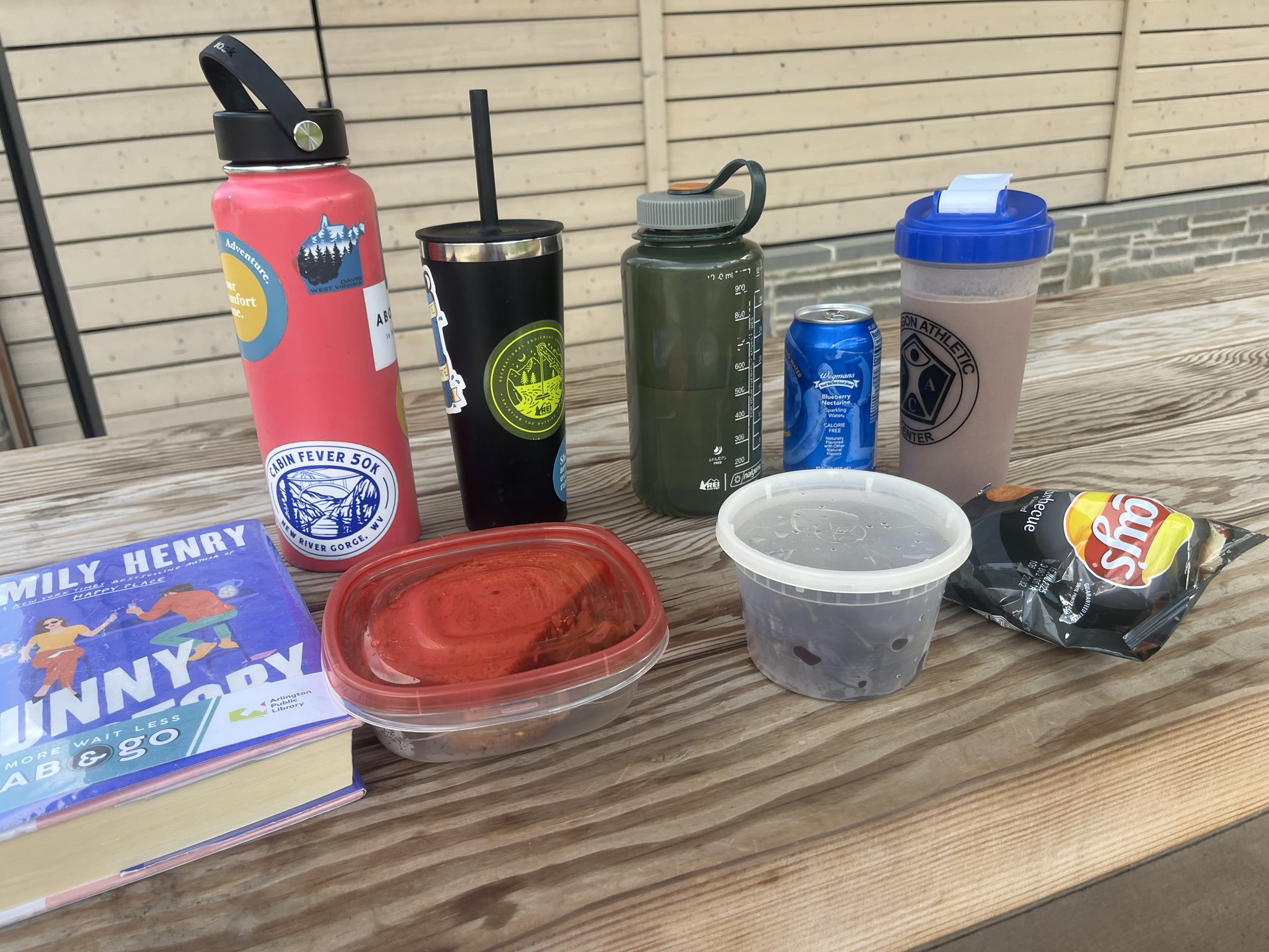 - Gather your post-run food and beverage line up, and find a picnic table gloriously in the shade, but unfortunately swarming with mosquitoes. From left to right for the drinking vessels: LMNT, iced english breakfast tea, water, sparkling water, post-run protein/carb shake. On the bottom, Funny Story by Emily Henry, a chicken sandwich, cherries, chips.