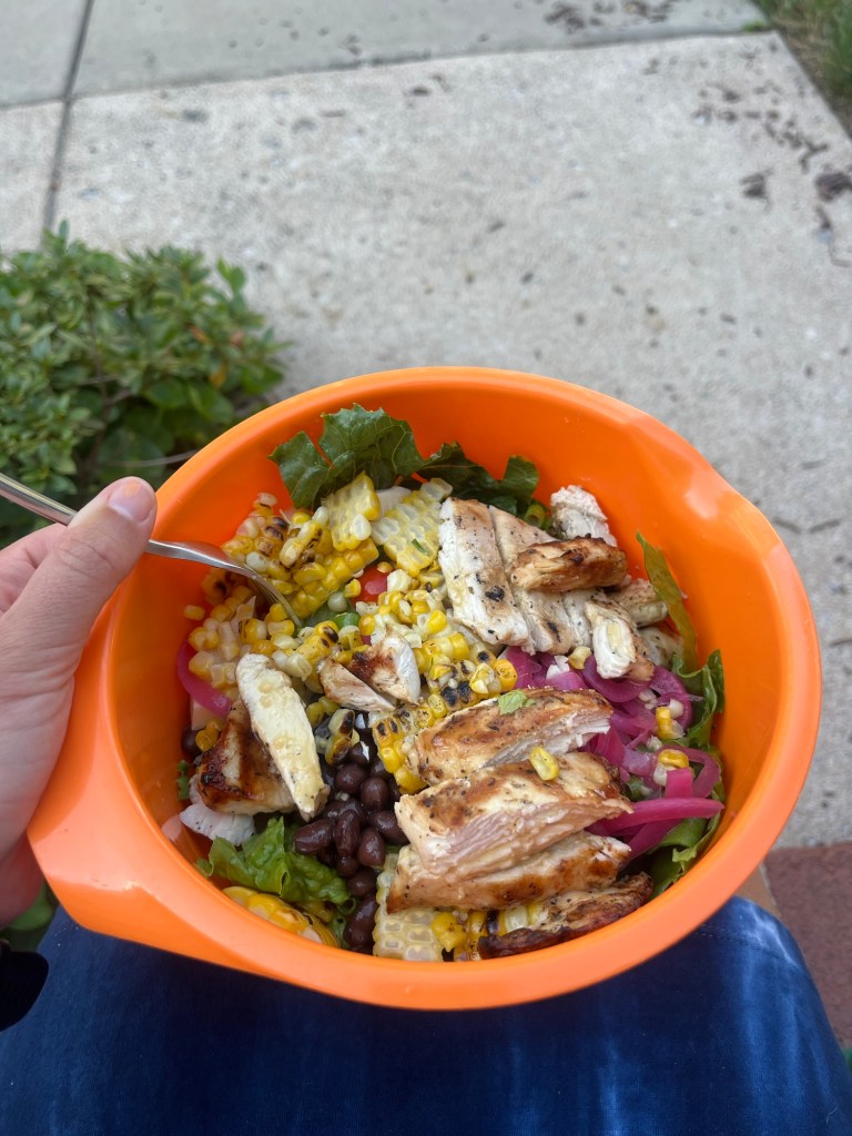 We made this BBQ Chicken Salad on Monday night. It had romaine, grilled chicken, grilled corn, pickled red onion, black beans, cheese, chives, and garden-fresh tomatoes. It was dressed with an unexpectedly delicious homemade honey mustard dressing!