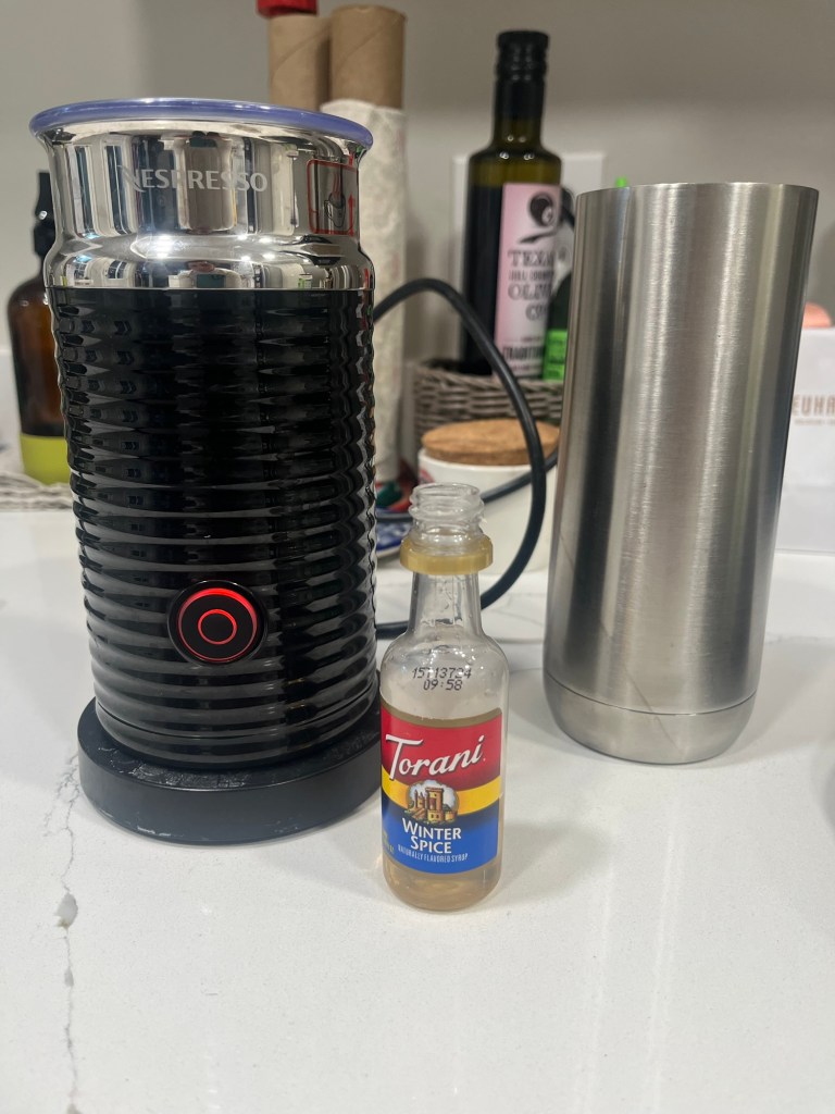 I made myself a winter spice latte and added a dollop of pumpkin whipped cream! I enjoyed this at work on a very busy day.