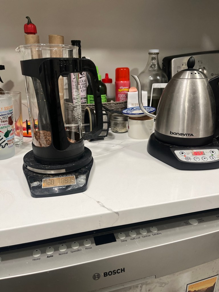 I was up first this morning and made a normal carafe of coffee. Why? Because I knew Patrick would have strong feelings about how a French press should be made! He slept in a bit, so once he was up we got started!