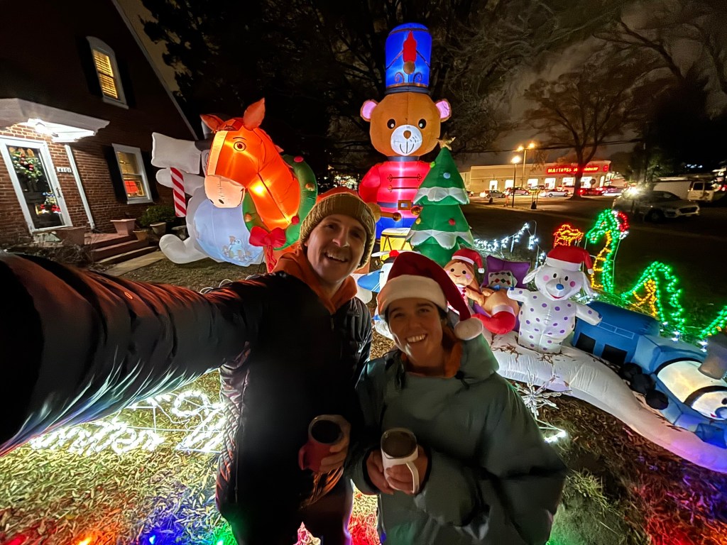 This was so fun! We got rained on a tad, but we trucked on and I played Christmas music on my phone. Shockingly, the neighborhood hasn’t decorated as much as I expected. The courtyard we took this picture in front of has gone all out!