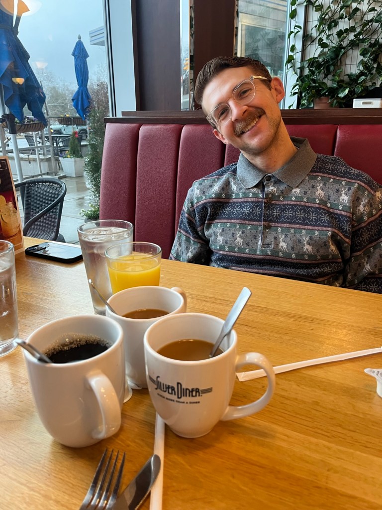 I’m writing this post while I wait for Patrick to finish his eye appointment (mine was first). But before we came here, we went to Silver Diner (finally!) for breakfast and coffee with our friend (and, conveniently, neighbor) Margaret! The coffee was shocking good, the food was tasty, and the company was wonderful. What a great Friday!