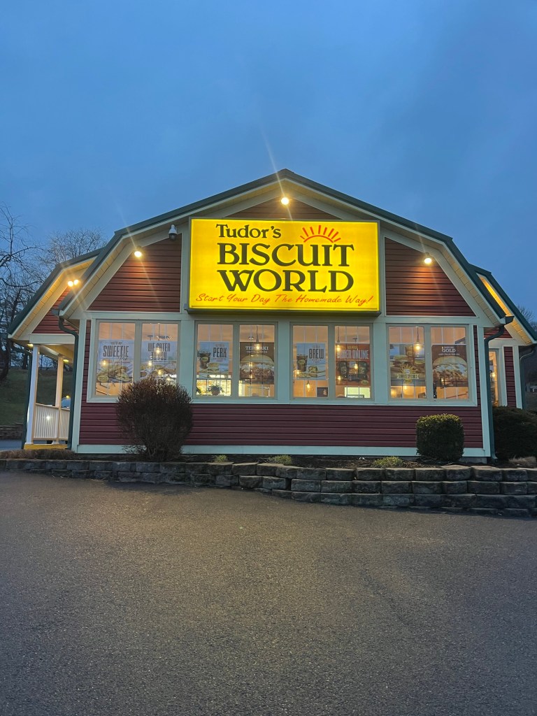 I didn’t sleep very well Saturday night due to a headache and generally being very sore. There was snow in the forecast, so we’d decided to wake up early to scope out the situation. If snow was sticking on the ground, we were going to pack up and leave ASAP to try to outrun it. If it wasn’t, we were going to go to Tudor’s Biscuit World for breakfast before heading out. Fortunately for us, the snow was melting as soon as it landed!