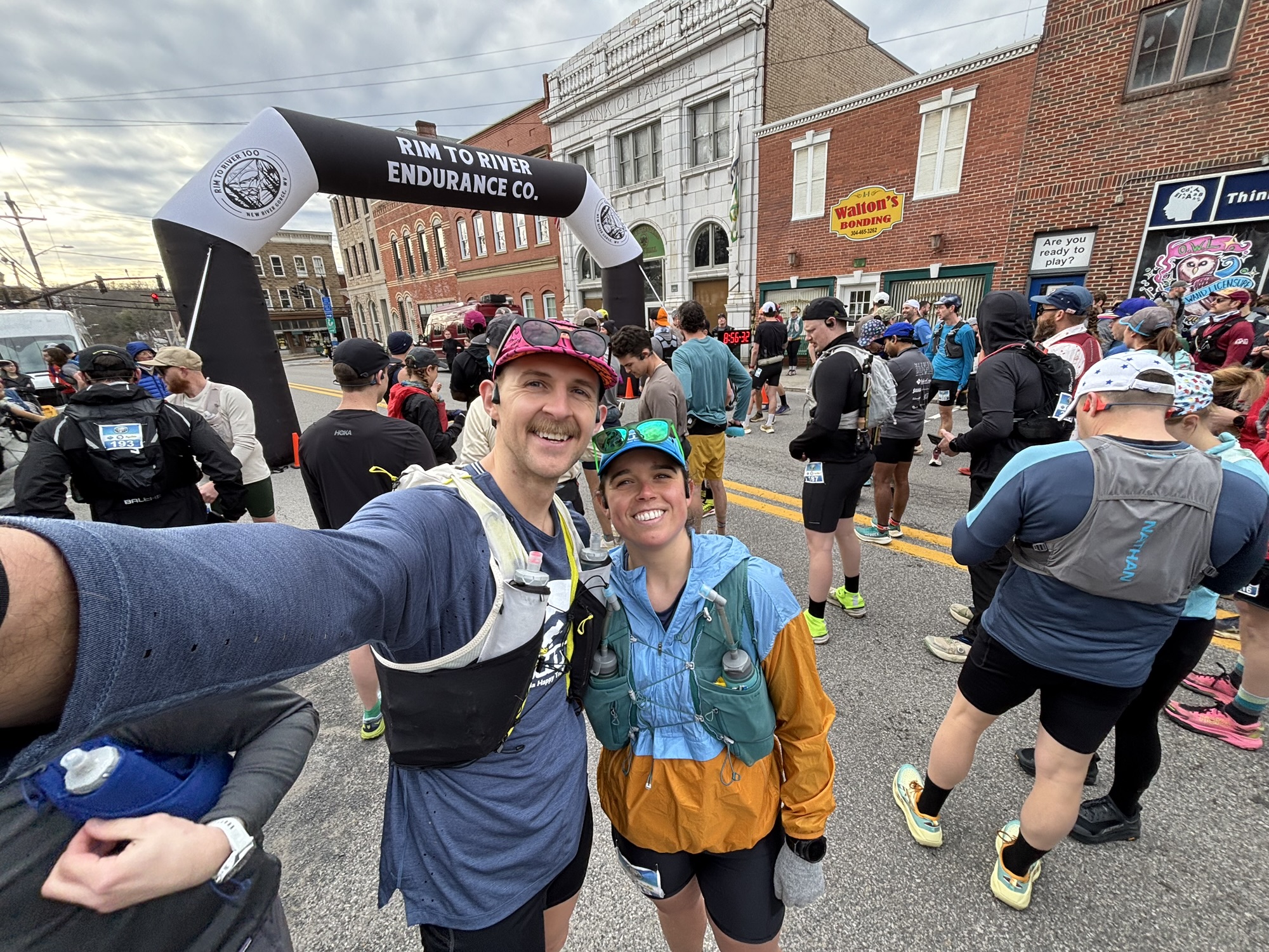 The start line is in downtown Fayetteville. It wasn’t rainy or too cold this year, so it was actually pleasant to hang out at the start! We had some coffee and meandered in the outdoor gear shop before the race started.
