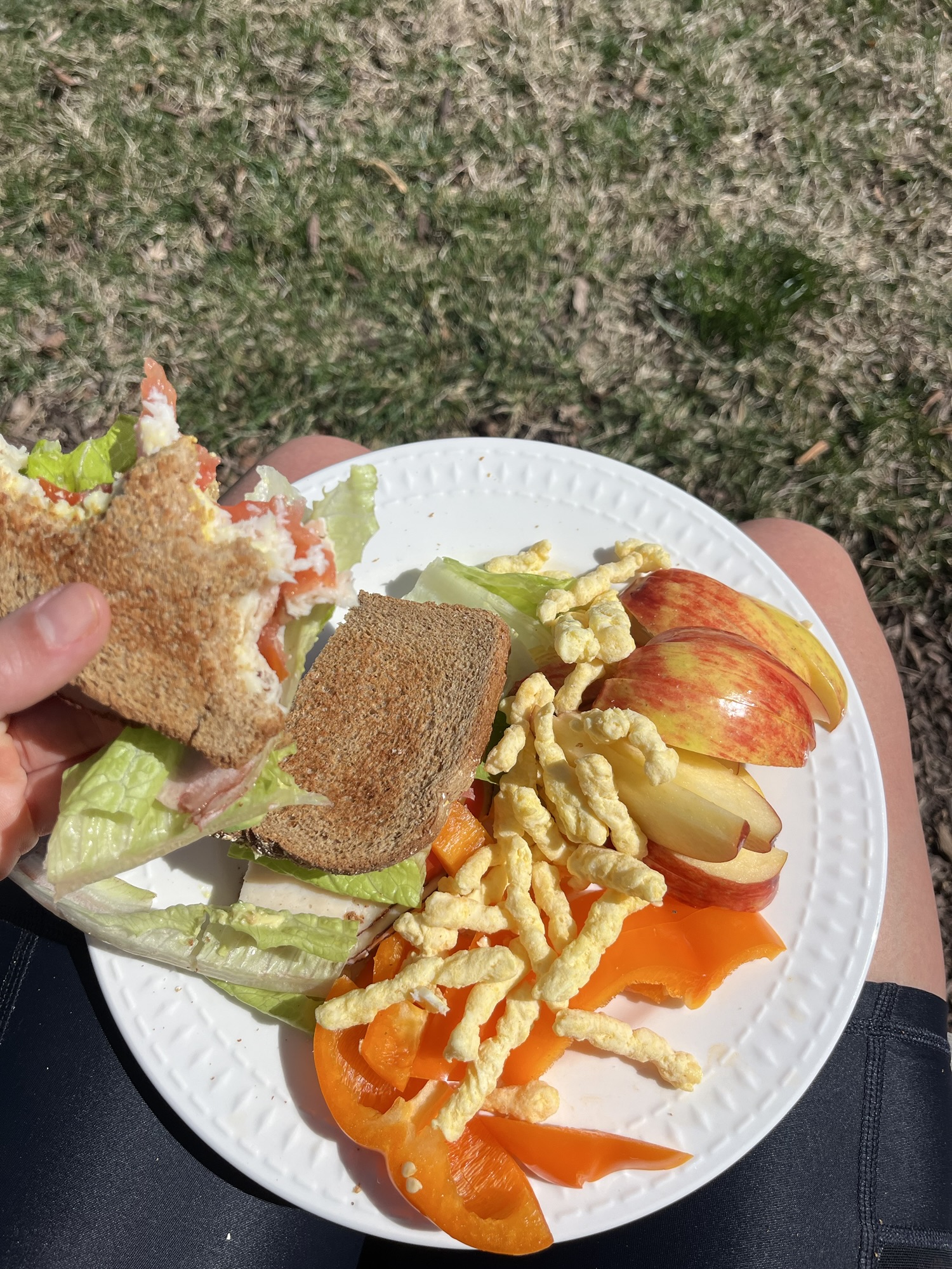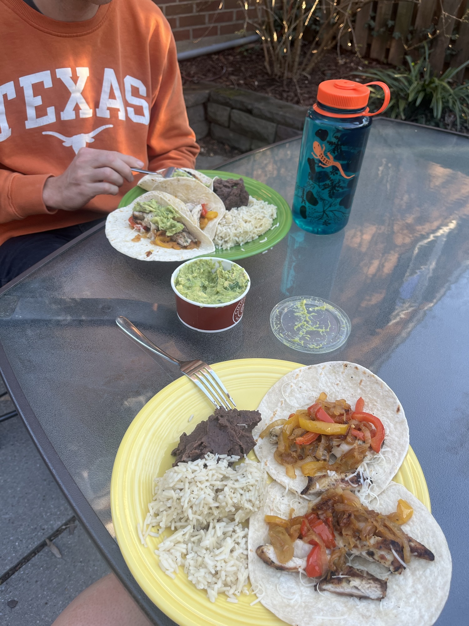I enjoyed my favorite style of lunch (deli meat sandwich + fruit + veg + chips) on a bench in our courtyard and then chicken fajita tacos on the back porch for dinner.