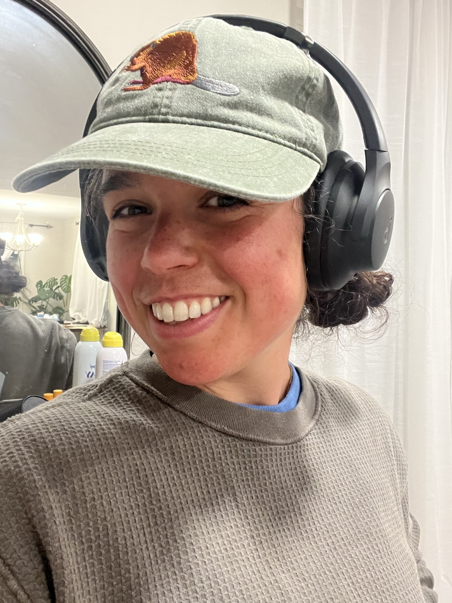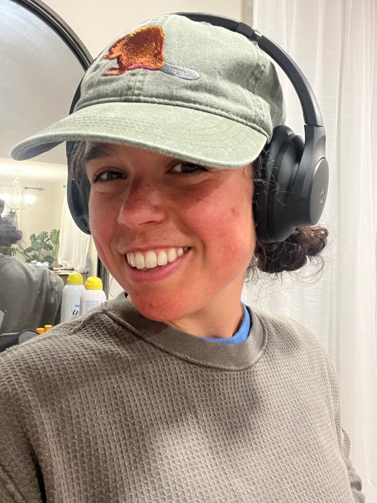 I don’t wear hats casually all that often, but when I do, I don’t like wearing my hair down. Way too poofy! Putting a ponytail through the back hat hole (does it have a real name??) works okay but is also not my favorite. Instead, I sometimes throw my hair into two messy little buns low on my head and I love it.