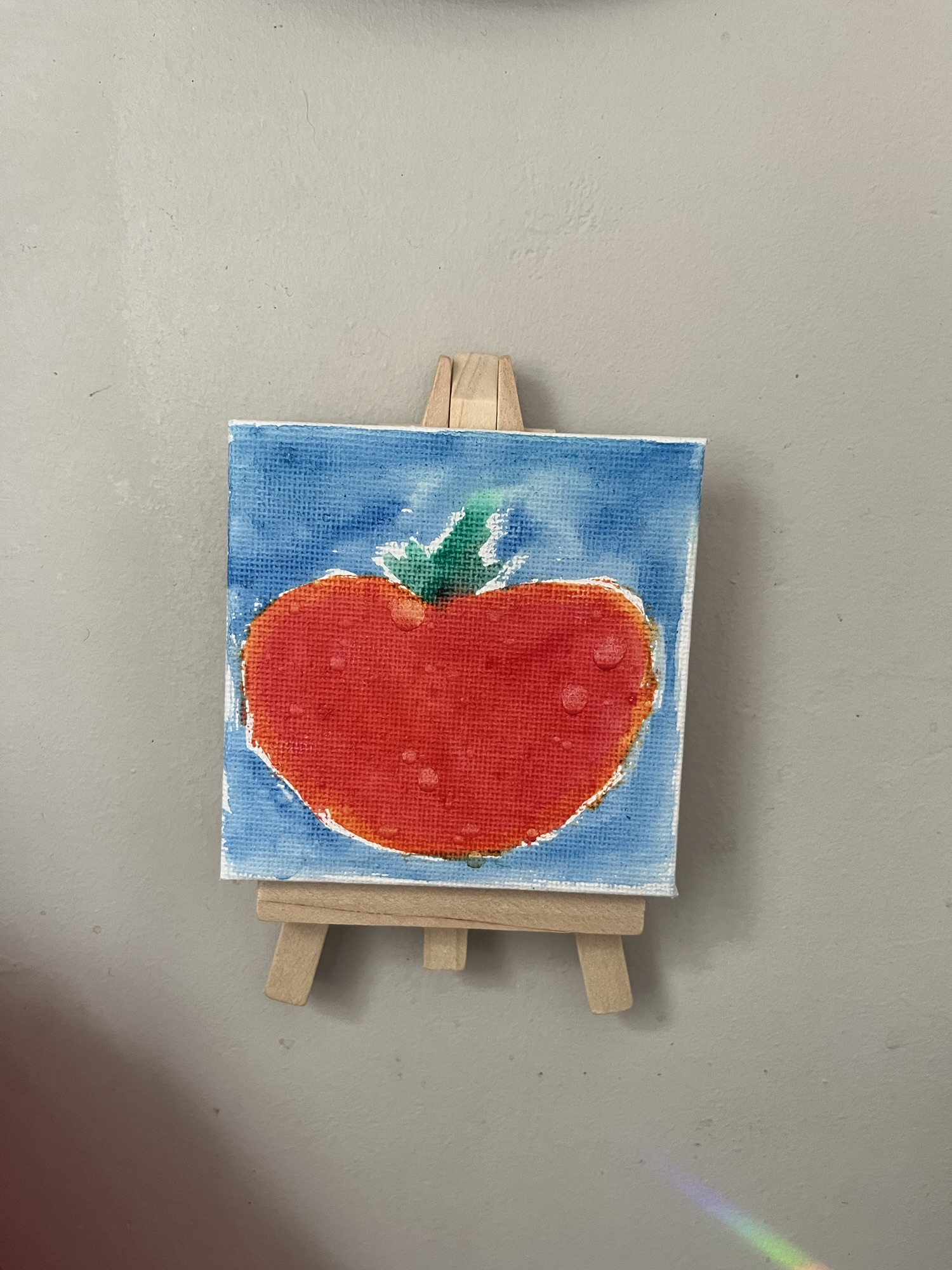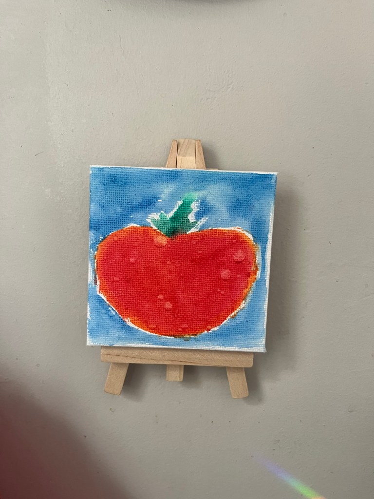 I had a teeny tiny canvas and easel, so I quickly painted a little tomato on it. I was very pleased with how it turned out! It lives on the wall next to our sink, so it gets splashed from time to time and the watercolor has spread. I think it looks like the tomato itself has been freshly washed and still has droplets on it. It makes me happy every time I see it.