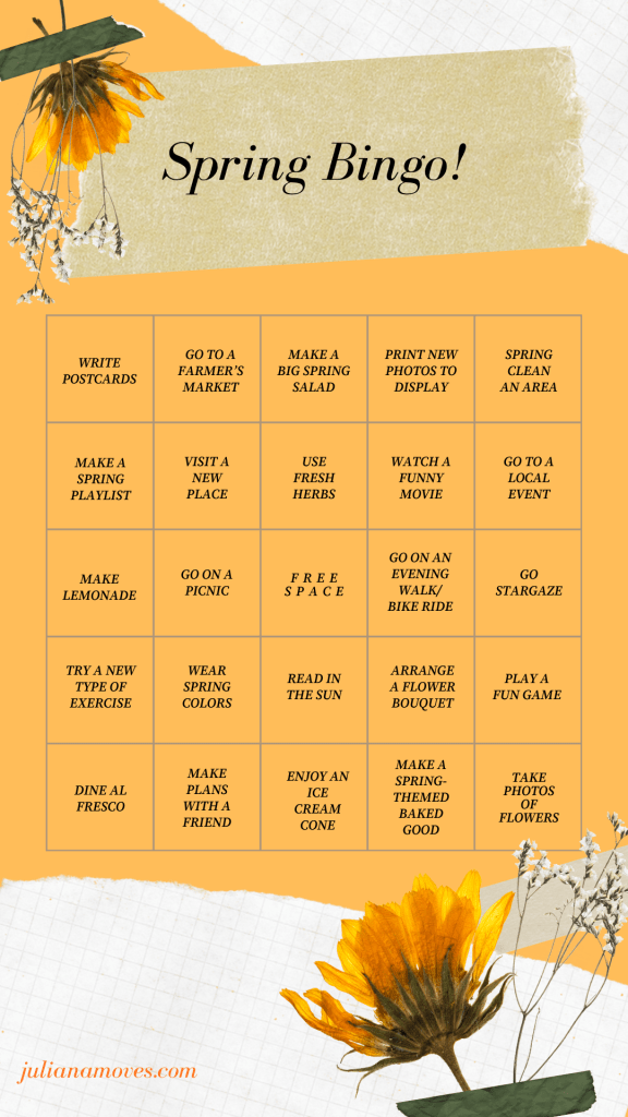 Well, I was perusing Pinterest this week and came across a ton of spring bingo cards. I felt inspired by them but they were all a bit too cheesy for me and not all the actual activities seemed like something I would care to do. I decided I’d make one for myself! Thanks, Canva.